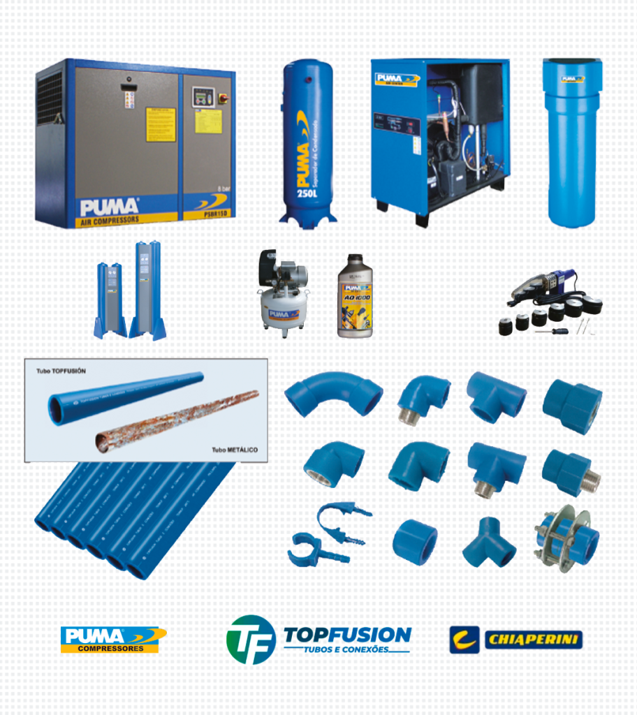 Compressores à Parafuso | Compressores à Pistão | Secadores de Ar por Refrigeração | Secadores de Ar por Adsorção | Filtros Coalescentes | Tubos em PPR | Niples | Luvas | Válvulas de Segurança | Válvulas de Esfera | Mangueiras para Ar Comprimido | Engates Rápidos | Bicos de Limpeza | Pistolas de Ar | Manômetros